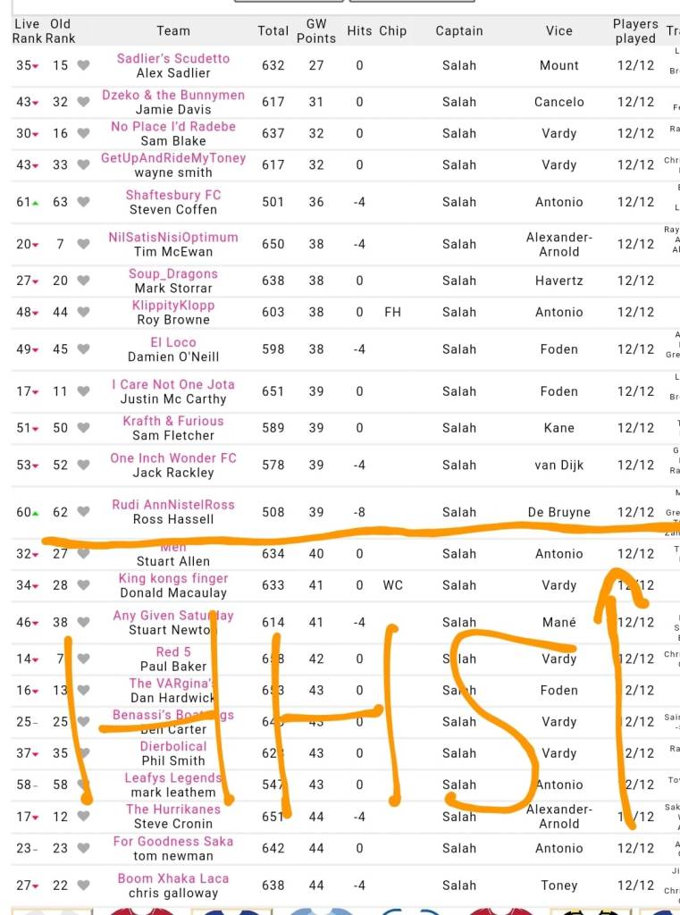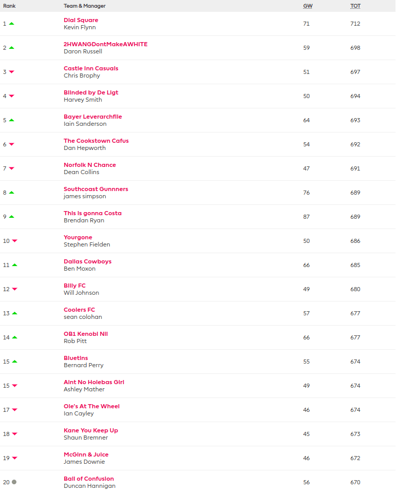 But kudos to BRENDAN RYAN – THIS IS GONNA COSTA for the highest GW score of 87pts and RONI FRIEL – SOUTHBOURNE CELTIC coming a close 2nd with 85pts. Massive green arrows for both this week.