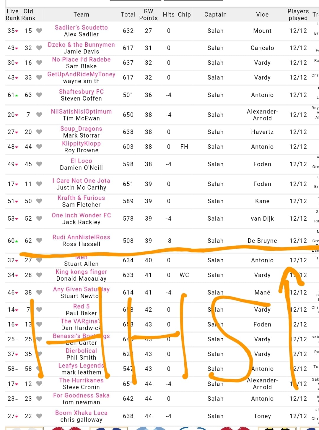 But kudos to BRENDAN RYAN – THIS IS GONNA COSTA for the highest GW score of 87pts and RONI FRIEL – SOUTHBOURNE CELTIC coming a close 2nd with 85pts. Massive green arrows for both this week.