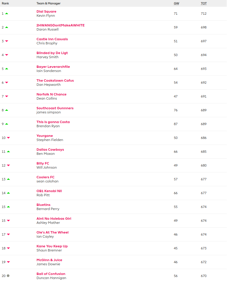 42 points separate 1st to 20th, currently occupied by DUNCAN HANNIGAN – BALL OF CONFUSION (670), who in turn is 21 points ahead of 50th FFUKer REECE COOK – VIVA RONALDO (649).