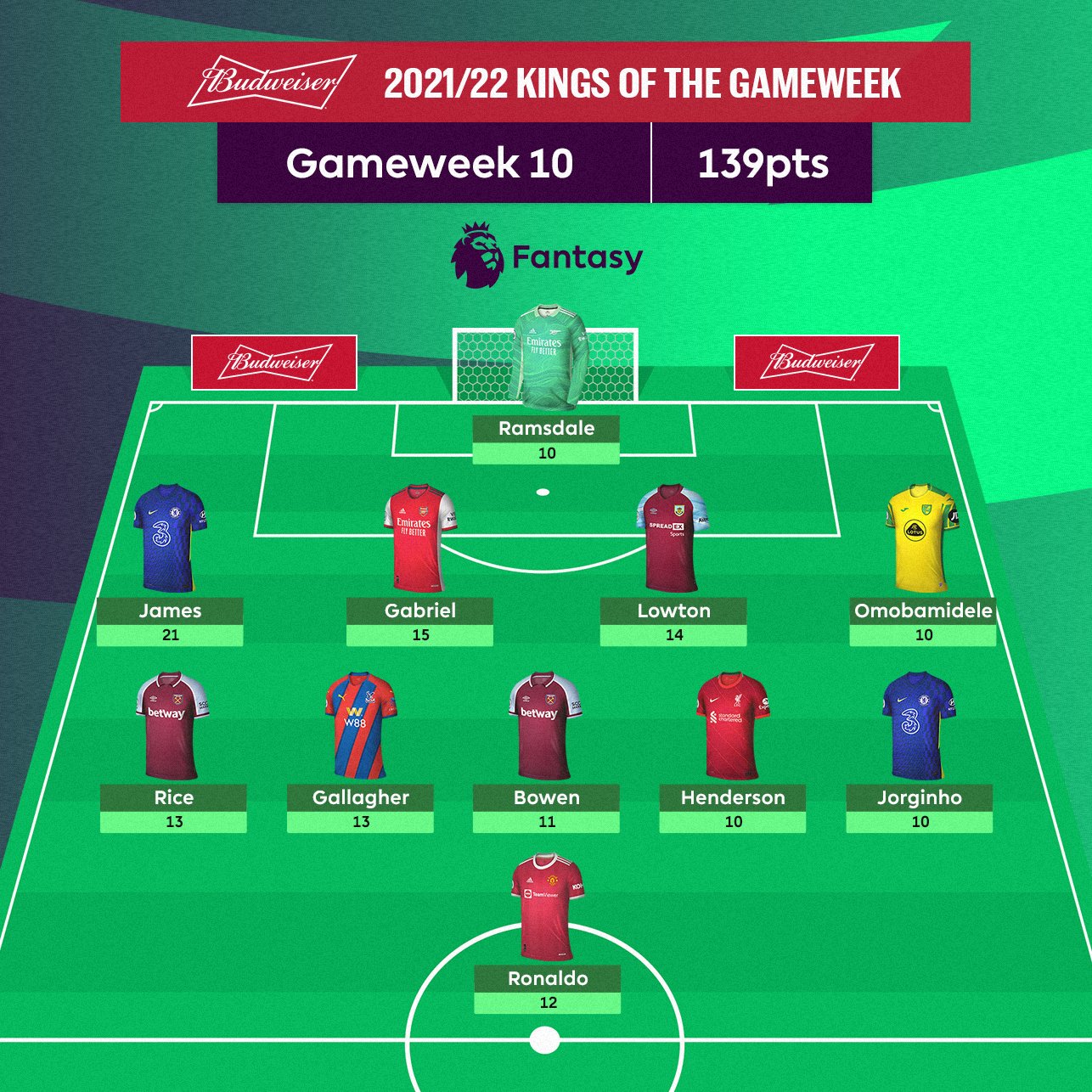 Let’s begin with The Kings of the Game Week. A few surprising inclusions as is often the way, particularly the £3.9m Norwich defender OMOBAMIDELE (10) whilst arguably JORGINHO (10) only made the team because he selfishly wanted his goal bonus and deprived JAMES (21) of his hat trick!