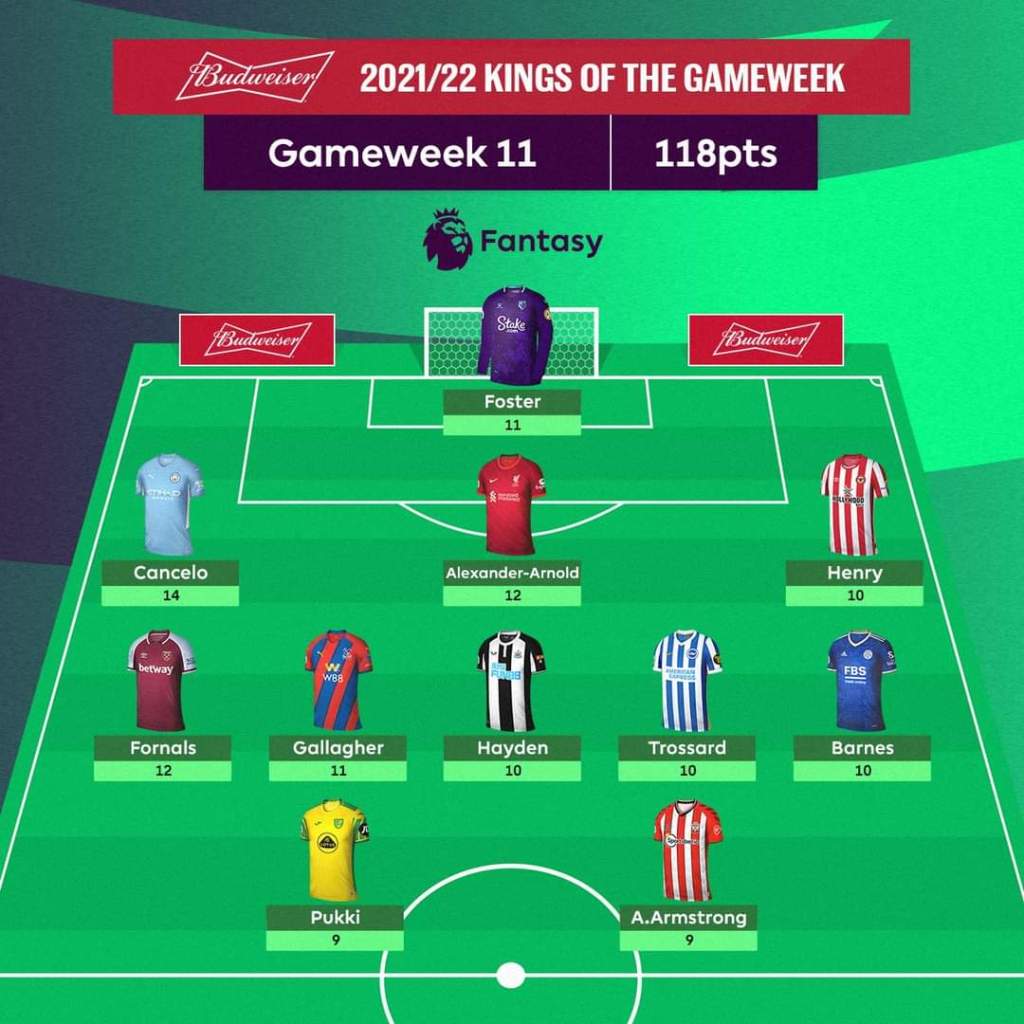 I am assured GW11 did in fact happen so let’s take a quick look and see what we can learn before we move on for good. Probably the most remarkable thing from an FPL point of view this week was the Salah captaincy stats. We’ve never seen anything like it with 94.4% of the top 10k and 75% of ffukers captaining him. Indeed you have to go as far down as Tom Newman (46th) in the ffuk mini league to find a top ffuker that didn’t captain him. While he didn’t set the game alight he still got the assist for Trent’s free kick and with none of the next most popular candidates firing it looks set to be the same dilemma next week. Trent himself scored 12 points thanks to a goal and an assist, despite conceding 3 goals. Cancelo (14) got a clean sheet and two assists and could have had more again with Rico Henry (10) rounding off the defensive returns somewhat to the frustration of us Toney (1) and Mbeuno (2) owners whose patience may be wearing thin despite favourable fixtures and underlying stats. Foster (11) rewarded the small number of his 22.8% ownership that actually played him with a penalty save and all 3 bonus points.