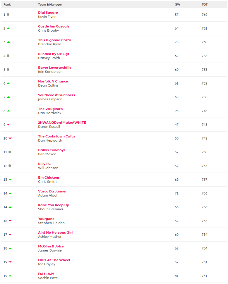 It looks like the Cork Mafia atop the FFUK mini league and I have to take the blame for inviting Kevin Flynn (1st) and Brendan Ryan (3rd) into the league. It’s early days lads, it’ll never last. I don’t know if Chris Brophy (2nd) has Cork connections but The Castle Inn is one of the best pubs in town so he can have honorary status if not. There is the usual jostling for position elsewhere with some notable names in the top 10. The biggest mover this week is Dan Hardwick (8th) who moves up from 42nd to 8th courtesy of the GWs highest score of 95. Excellent use of bench boost from Dan with 28 extra points making all the difference.