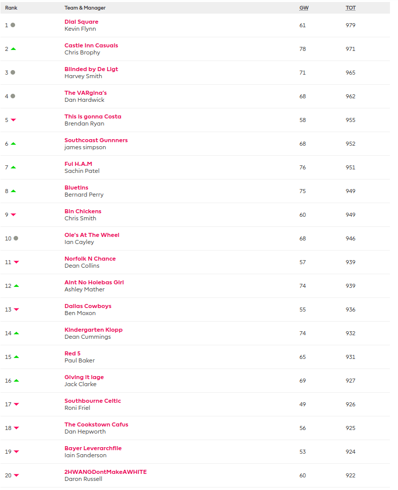 So what does all this mean for the league? Well at the business end of the table KEVIN (insert Home Alone Voice over) Flynn still leads the charge on 979 points which has him neatly inside the top 5k overall, globally. A quick squizz at his game history shows this is no fluke and I expect him to be up there around the business end of the season. Great work Kevin.