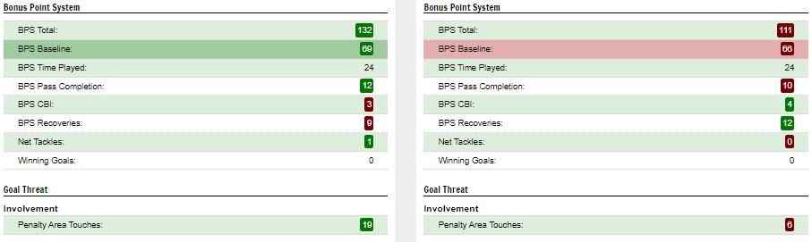 Stevie G made his return to Anfield as the AVL manager and made me laugh when being asked by Michael Owen how do you feel going back, Michael stating he hated going back to Anfield not being a Liverpool player. Gerrard responded saying he would hate it too if he had played for Utd! cracker! The game itself was a tight affair with yet another pen settling it for LIV, Salah stepping up to do what he does best, hitting the back of the net! Jota missed a hatful of chances and TAA picked up the 3 BPS whilst Salah did his best to avoid them. After watching the match the eye test really got me thinking about Robbo who looks to be in top form post injury. I used FFS to do some analysis on Robbo v Trent over the last 4 GWs, Robbo comes out very favourably indeed as below, the penalty area touches really stood out for me 19 v 6 in Robbo’s favour over the last 4!