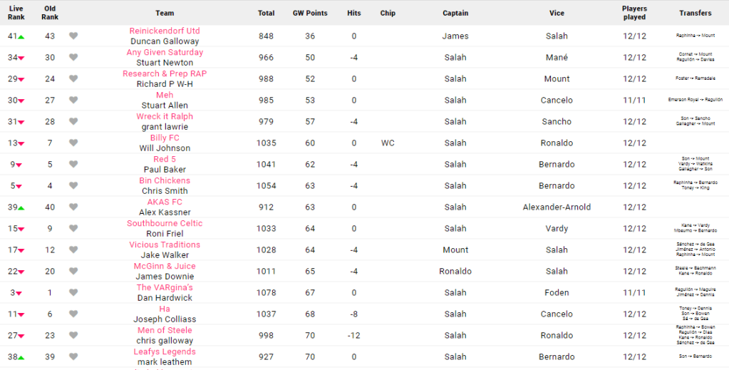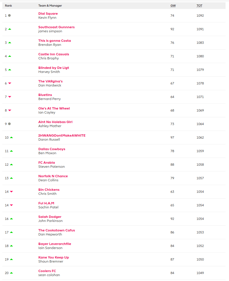 The great and the good are really knocking on with their OR’s, putting them in great position within the FFUK top 20!! Kevin Flynn is continuing to hold onto 1st place with another solid 74 points this week! Tom Newman gets the nod for manager of the week, although unfortunately hitting the bar attempting to join the 100 club with a fantastic 99 points!!! Big shout out to my stablemate James Simpson who has moved into his highest ever FFUK position in 2nd, 1 point off Kevin at the top!! Another excellent score of 92 with no hits allowing him to continue his push up the table!
