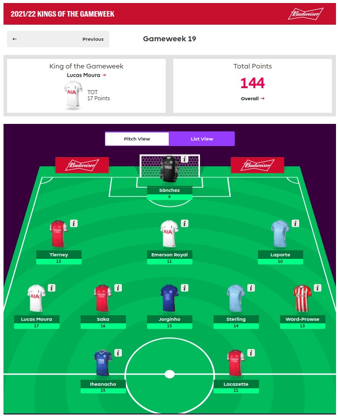 Fantasy Football Scout’s pre-GW19 polls make interesting reading in retrospect. For the captaincy, Ronaldo (1) sat on 34% of votes, and was captained by 31% of the FFUK league. Kane (6) and Son (8) account for 26% of the vote while 10% left the armband on Salah, and were either taking their trip early or late. Sterling (14) didn’t really get a look in and at bottom of the league Norwich, managers stumped for Martinelli’s 3 points (5/% of the captaincy) rather than Saka (16) or even Smith-Rowe (6). Trippy.