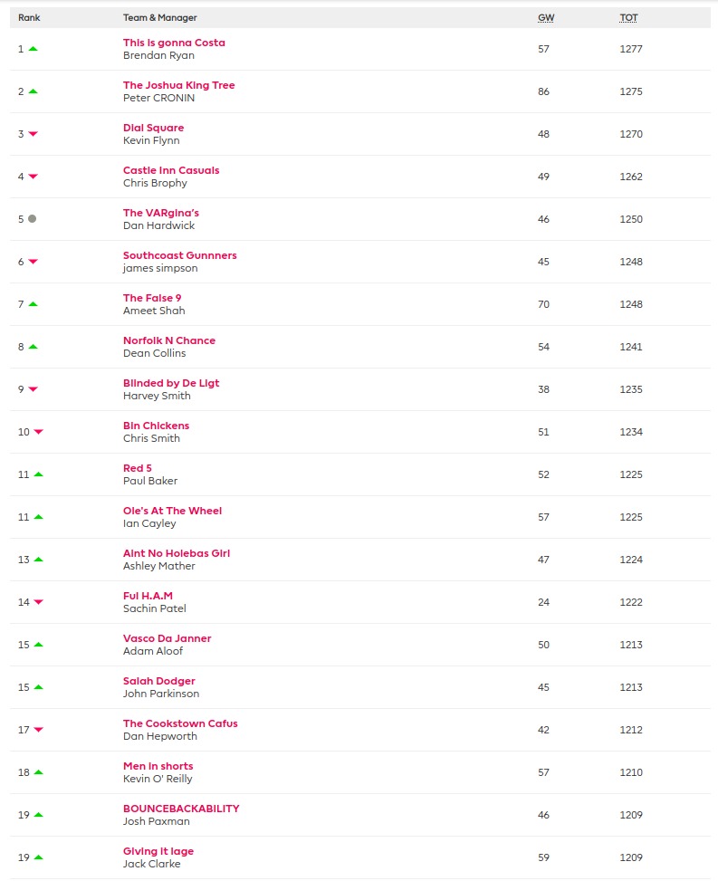 I’m sure I’m supposed to say something important now so I’ll tell you something about hits. I was having a look at some of the top top players in the game this week, looking at strategy etc, and wondering whether they have taken many hits. As you might imagine, the top of the game is littered with debauched chancers taking free hits, taking -4s, and with the number of games getting cancelled at the moment we can all understand. Saying that, we haven’t had any more postponements today which is new, but we do still have a few hours to go.
