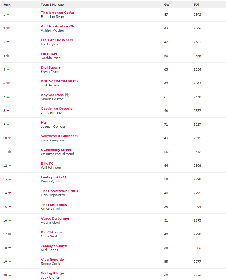 Brendan Ryan (1st) sails back to the top. A GW high score (before hits!) of 87 puts Brendan 26 points clear at the top.