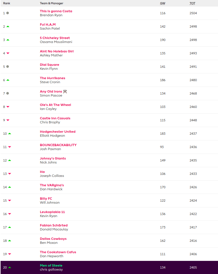 There were joint top scorers for this GW and the season thus far – Steve Cronin (6th) my unofficial (Last Action) hero and Ossama Mouslimani (3rd) both scored 186pts!! SUPERB!