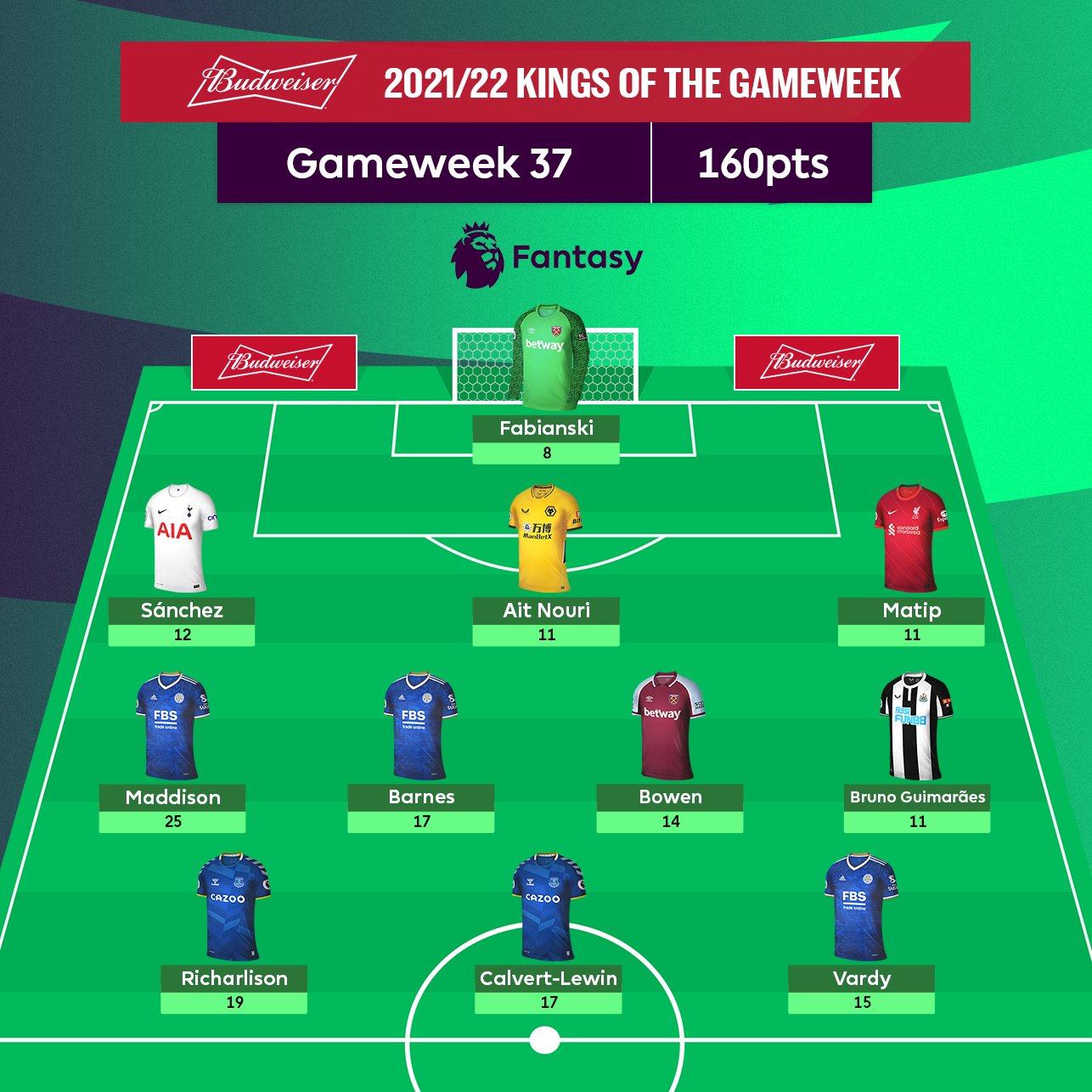 Leeds managed a much needed point against Brighton (but would it be enough!?) in a 1-1 draw with Brighton. Already relegated Watford got thumped 5-1 by Europa Conference league chasing Leicester. Jamie Vardy (15pts) making a timely return to form as he continues his rehab from injury. Maddison with a goal and assist in the first game followed by a goal against Chelsea saw him top score for GW37 with 25 pts, Harvey Barnes (another England squad hopeful) showed his class with 2 goals and an assist (17 pts).