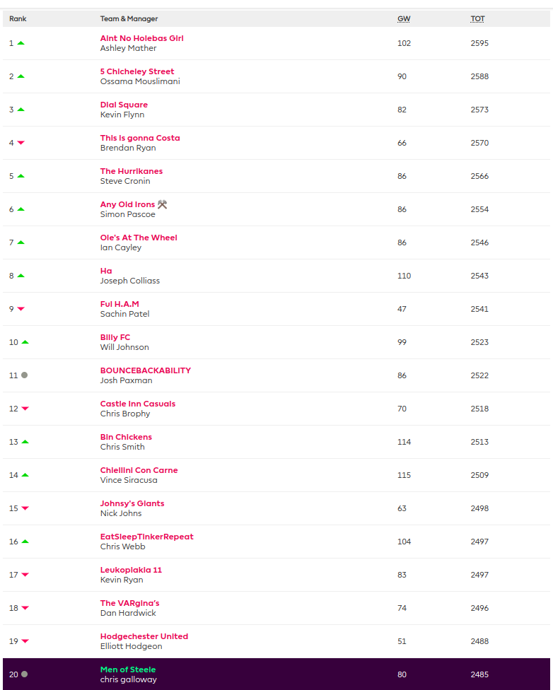 Top scorer in the league this week was Iain Sanderson (50th) with 121 points which is exactly the sort of score we were all dreaming of pre deadline. James Amar (89th) pushed him close with 118. Remember there is a prize for best GW score in GW38, on top of the season bet GW prizes.