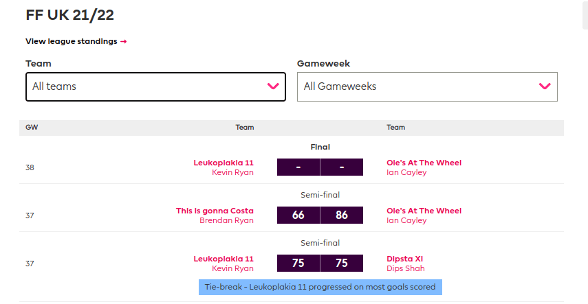 In the, new this season, FPL FFUK Cup, as you can see below the final will be between Kevin Ryan an Ian Cayley.