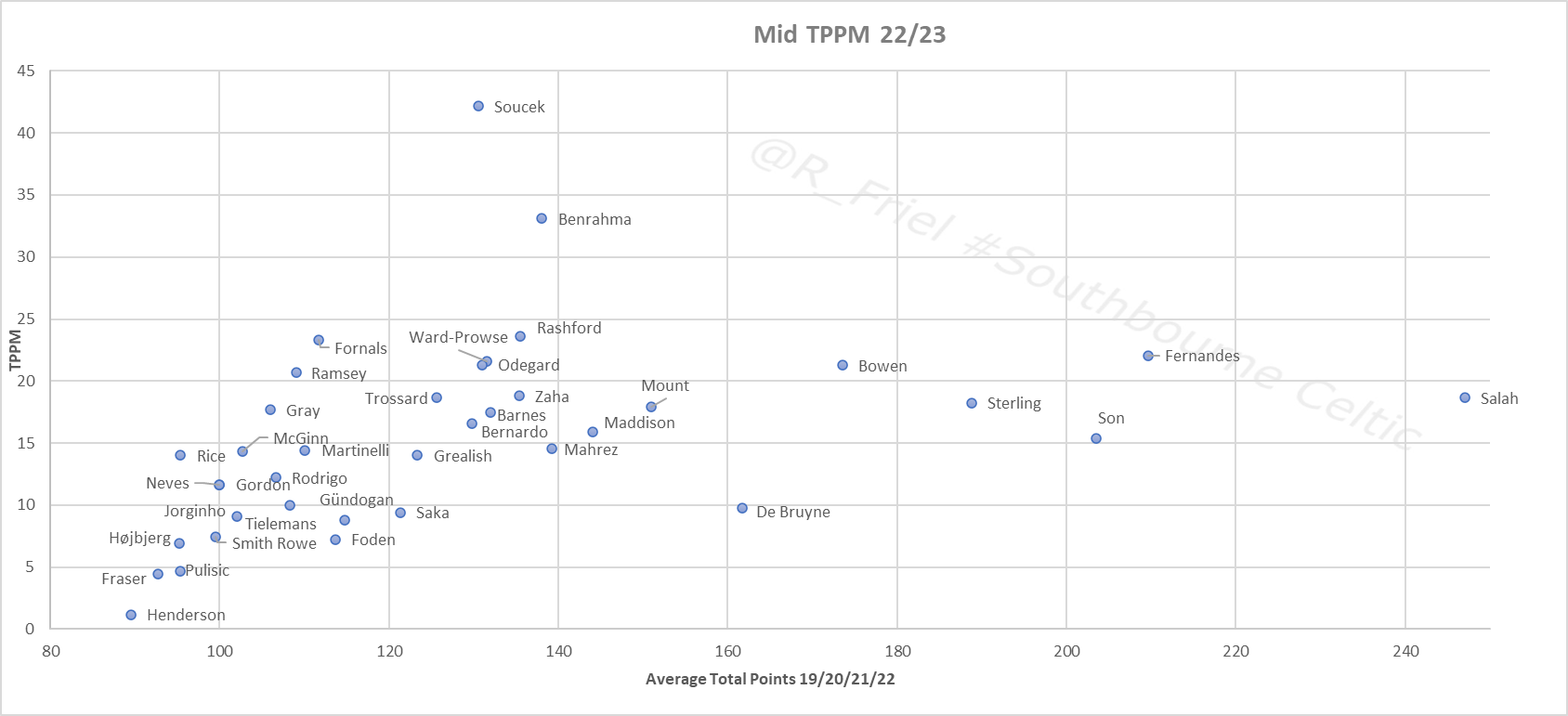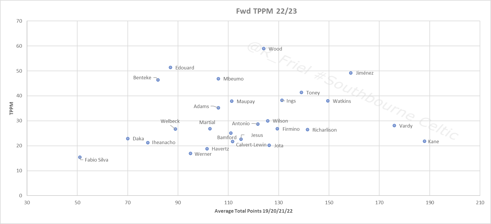 To obtain TPPM for each player I apply the following, (note this years stats are an average of the previous 4 years FPL returns, there are some modifications for positional changes, eg Mbeumo)