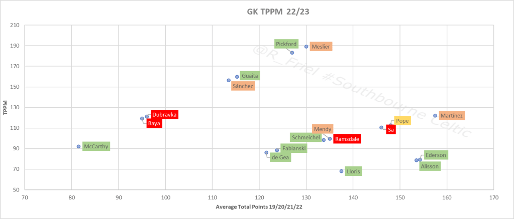 Based upon the TPPM calculations Meslier 4.5m @ Leeds provides the greatest bang for your buck statistically delivering a TPPM haul of 189 per million spent, however when we add the qualitative knowledge of Phillips departure to City do we have confidence in the post Bielsa era to deliver the same level of returns. We are left with a similar conundrum when looking at the next GK on the list in the shape of little Pickford 4.5m @ Everton, he has 4 solid years of data indicating a TPPM return of 183, however with Everton considered one of the favourites for relegation we again ask ourselves can he maintain the previous seasons returns.