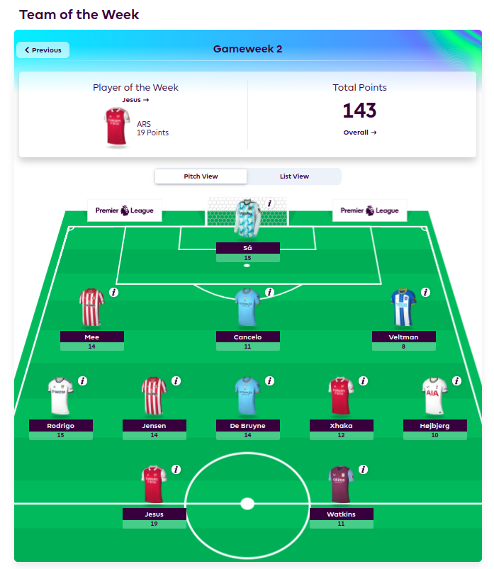 In the league top scorer takes top spot this week. Congrats to Dan McBrearty (1st) with 96 points scored courtesy of a KDB captaincy and of course he believed in Jesus. The rest of his congregation, Cancelo, James, Trippier, Diaz and Martinelli all returned too taking him from 44th to top spot in one week!