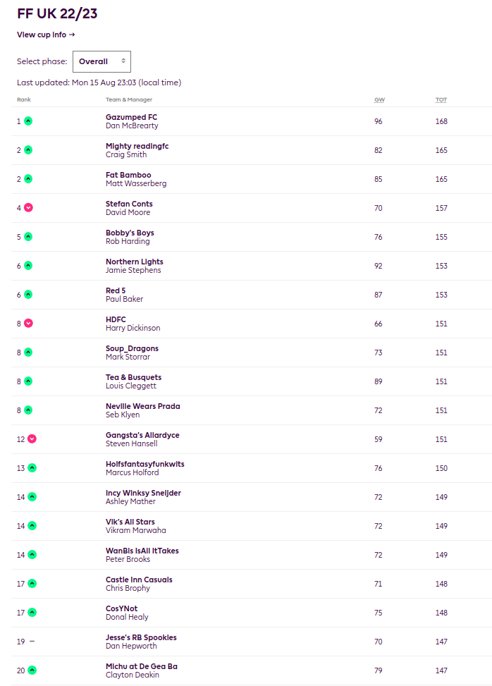 Things move fast at this time of the season. You have to keep believing. Ignore ranks and just focus on getting through these few weeks, just need to stay in touch with the pack. With both Salah and Haaland underwhelming after a strong opening GW nothing is certain in this game. What’s more most of us have a wildcard burning a hole in our pockets, 12 FFUKers used them after just one week. How many push the button this week? Do we keep the faith or ditch our players – this is the big decision we all have to face over the next few gameweeks.