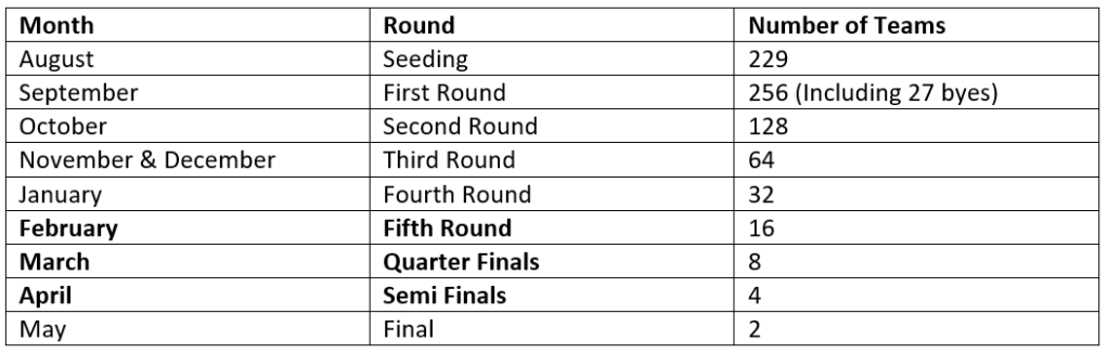 The First Round will include 27 byes meaning that the top 27 players in August will get a free ticket to the Second Round. The Fifth Round, Quarters and Semi Finals will have Live Draws, this scheduling being due to the short turn around between game months in the early stages of the season.