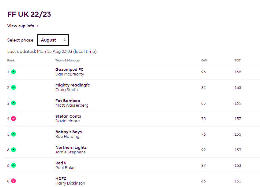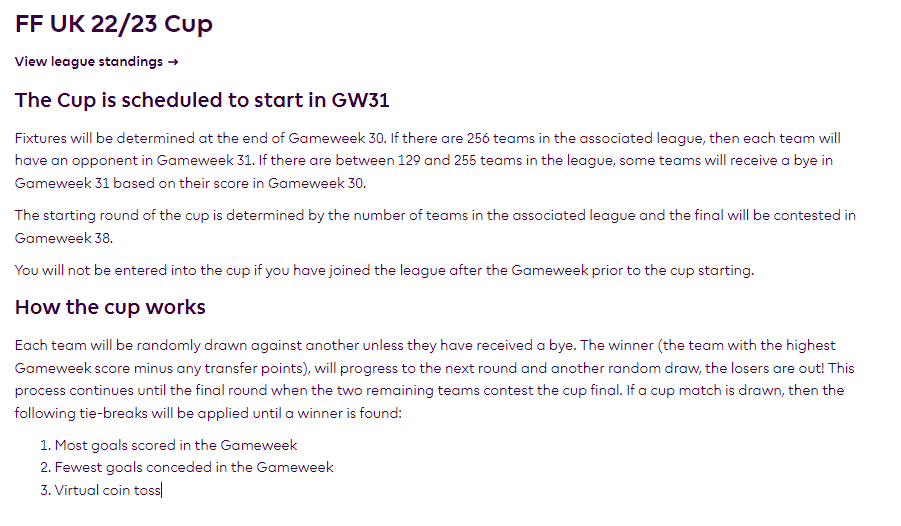 This Cup is a weekly game and starts late in the season, timed for a final between two teams in GW38, and therefore is scheduled to start in GW31. Like our own cup, 27 teams will be given byes in the First Round, and we will give prizes to the Winner, Runner Up and Semi Finalists.