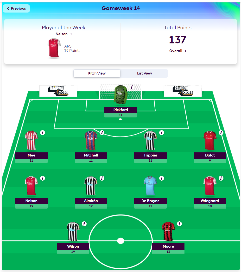On to Sunday and not so boring boring Arsenal, they just keep plugging away and fair play to the monobrow, who is doing a great job! Saka (4) with his 6th assist of the season lasted just 26 mins, sadly for some, but not for me as I had opted for Martinelli (8) who netted his 5th of the season. The Saka versus Martinelli investment dilemma rumbles on for many…….. where is the better value? The star of the show however, Nelson (19), on his debut for this season, with 2 goals and an assist in 63 mins of football – hats off to you!