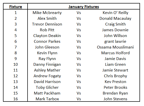 The Third Round saw a host of FFUK stalwarts through to the 4th, with Jamie Stewart knocking out Sean Griffin by a comfortable 39 points, James Downie downing Dan Hepworth by 35 points, and Don Macaulay seeing off James Felton by a margin of 11. Craig Smith can be very grateful for his Christmas gifts, earning the prize for lowest scoring winner with 193 points for the month, beating Mark Turnbull b y just 2. However, the crunch tie has to be John Gleeson v top of the league John Harper, who drew on 261 points for the month, going to a tiebreaker, and John Gleeson sitting pretty due to goals scored.