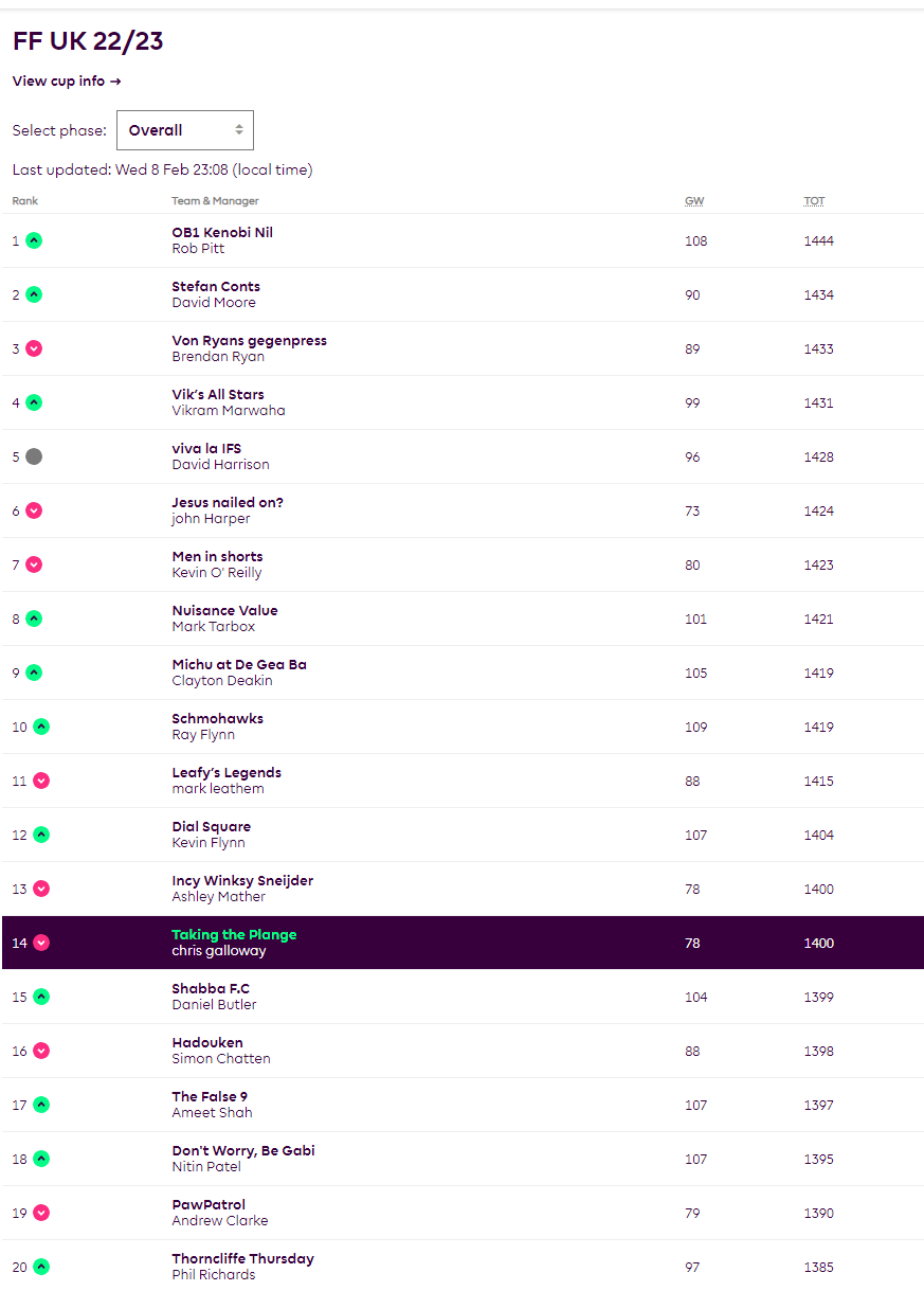 Top GW scorer this week was Tina Whitehouse (37th) with 115 points scored – very good indeed! 33 FFUKers made the 100 club this week with the help of the Rashford captaincy so well done to all those – especially those that hit 100 points for the first time this season.