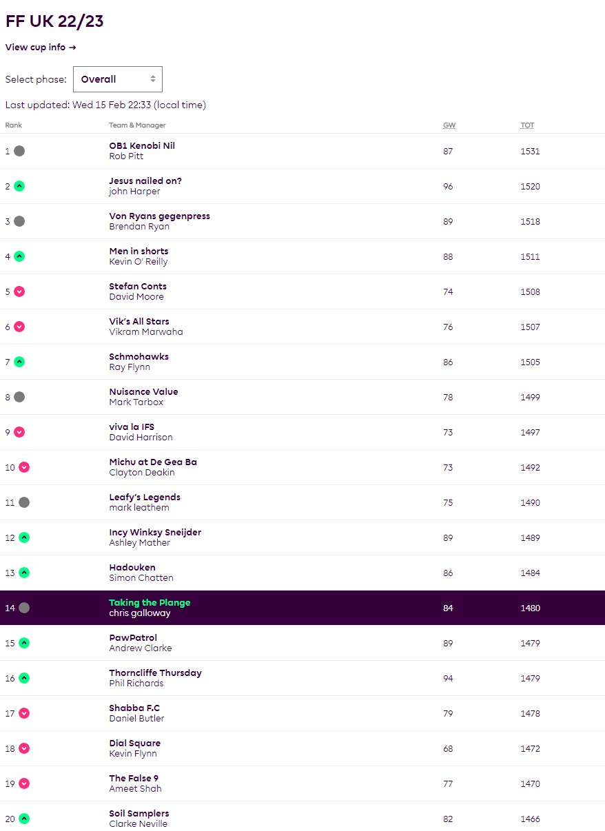Here is the top 20 – what can I say other than some proper big scores accumulating, very well done to you all, but who has upgraded Mark Tarbox in 8th, just keep your head down and focus on “me, myself and I” Tarbs – nose bleed territory pal – keep it up!