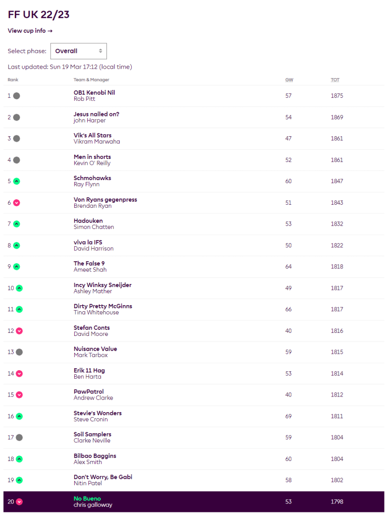 It’s tight at the top with just 14 points separating the top 4, with only John Harper having “Pushed the Button”, playing his FH this week.