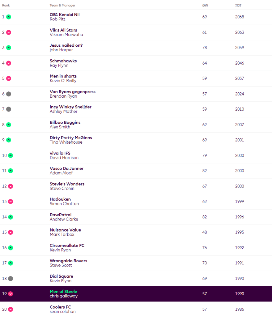 Not much variance (or surprise) with everyone in the top 20 captaining Haaland (12). Rob Pitt (1st) returns to top spot from Vikram Marwaha (2nd). This week’s top scorers were Mark Storrar (37th) and Stephen Mealor (215th) both scoring 85.