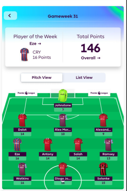 Watkins, Eze and Jota all joint highest scored this GW with 16 points, while Solanke (15), Salah (14), Antony (14) and Dalot (14) weren’t far behind. The average ownership of our GW leaders at a mere 9.67%. Is there any better feeling in a GW then picking a differential that hauls? (No, no there isn’t. Shout to my guy Eze!)