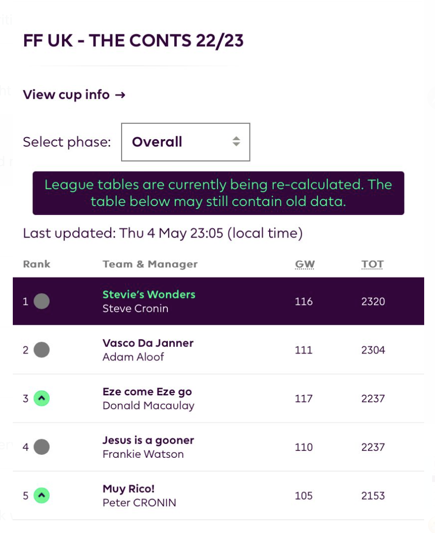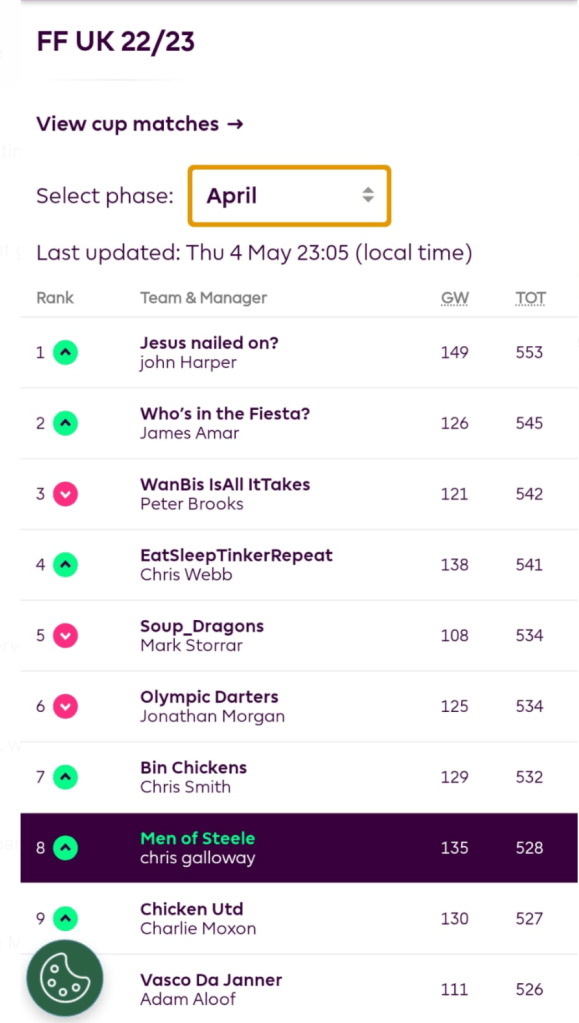 John Harper (1st) has extended his lead at the top. He was also our top scoring FFUKer this GW with 149 and also the FFUK MOTM for April.