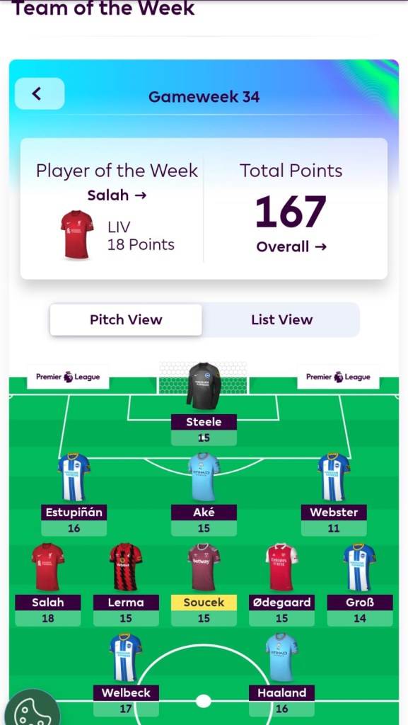 Palace won a great game. Maybe come backs for ex-England managers do work. Brighton thrashed Wolves and Bournemouth smashed Leeds. Liverpool won an entertaining and amusing game against Spurs. United won one game, 1-0 and lost one 1-0. It was so nice to see that the 99th minute penalty going against Manchester United versus Brighton for once. It was also nice for me, having Mac Allister in my team.