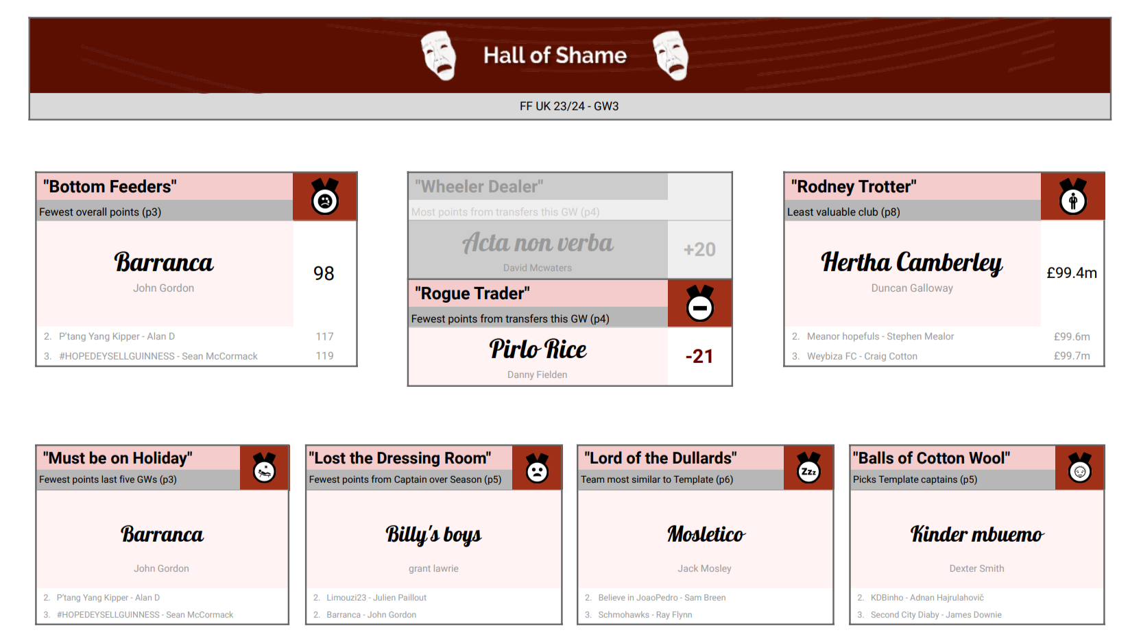 Manager of the month is Mark Tarbox and Stu Newton, both tied on 210 points, they also share the same top spot and overall rank which means they share the MOTM pot for August. Check out the MOTM page here