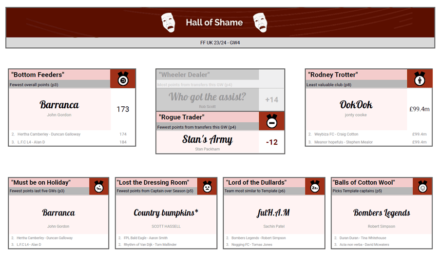 - Richard P W-H wins the unfortunate accolade of having benched the most points (58) this season – sorry to bring it up Richard, but it’s a great stat!