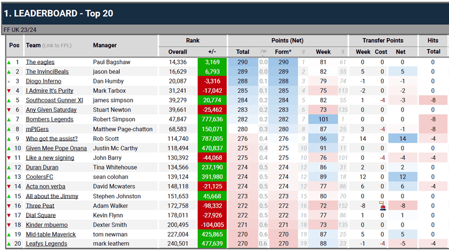 Arsenal vs Man U was the final match of the GW and again there was plenty of entertainment. Man U looked to have won it in the 88th minute when Garnacho (1) went clear and slotted home, only for VAR to rule he was marginally offside. Rice then banged in a 96th minute winner and Jesus (6) added some icing to the Gunners’ cake with a very nicely taken goal in the 11th minute of stoppage time. A draw would probably have been a fair result, so Arsenal will be delighted to remain on City’s coat tails, and Man U might feel hard done by to be sitting in 11th.