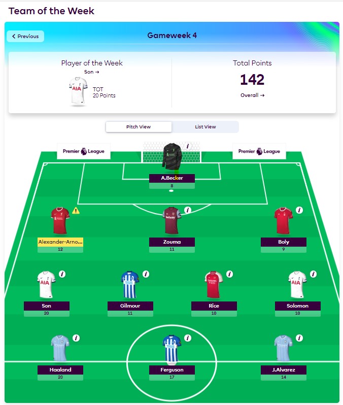 Another highlight from GW4 included Luton’s first Premier League home game at Kenilworth Road. West Ham spoiled the party with goals from Bowen (7) and Zouma (11), and Mads Anderson’s (8) injury time goal was too little too late. JWP (7) made it three assists and a goal in three games and is definitely one to keep an eye on.