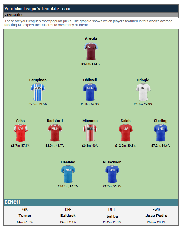 However, both Man City and Erling Haaland (20) can go one better than that. City have won all four games and it looks like it’s going to be a big ask for the chasing pack to keep up. Haaland tops the FPL scoring chart (and surprise, surprise, the Premier League scoring chart) and was captained by 214 out of 224 FFUKers. No doubt a few of the 10 who didn’t captain him just missed the deadline. 96% of FFUKers having the same captain isn’t ideal for FPL, but Haaland and City are phenomenal to watch.