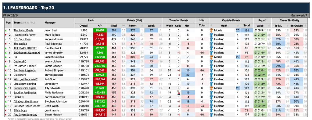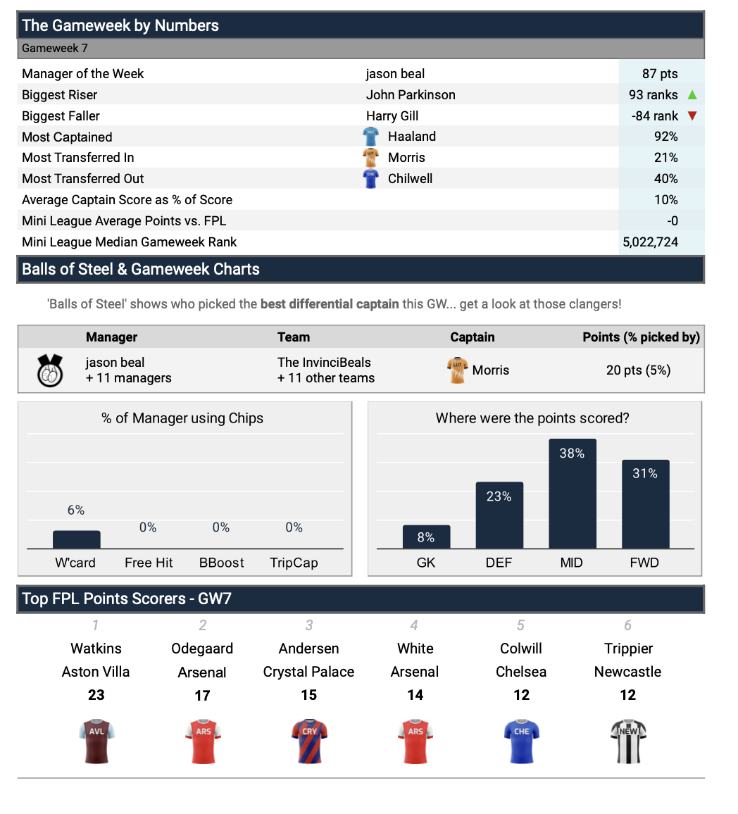 Special mention to top of the table Jason who not only captained Morris (10), but had Watkins and Ben White for his 14 pointer. Throw in Cash (6), Eze (6) & Pope (6) and he’s Living Proof, if you want to charge up the rankings, you got to break free from the template.