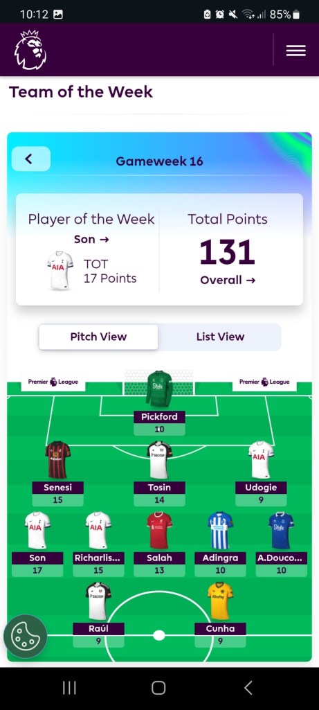 Son was Player of the Week this week getting a goal and two assists scoring some of you lucky FFUKers 17 points after an embarrassing 4-1 loss for Newcastle at the Tottenham Hotspur Stadium. Whether he’s on the left or through the centre, Son Heung-min is dangerous. Richarlison scores twice and makes it in the Team of the Week along with defender Udogie who was the first to score in the 26th minute. As for Newcastle, they look tired and in need of a rest. My double Newcastle defence killed me with Kieran Trippier having another bad game leaving him suspended for next game against Fulham due to 5 bookings, is anyone else thinking of taking him out?