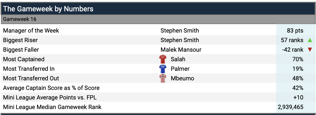 Lots of big talking points from the week with Salah scoring his 200th goal for Liverpool after a 2-1 win against Crystal Palace with a 91st minute winner coming from Harvey Elliot. Winning at the last minute is becoming a recurring theme for the Reds. With 70% captaining Salah after Haaland’s no show, 26 points isn’t a bad result.