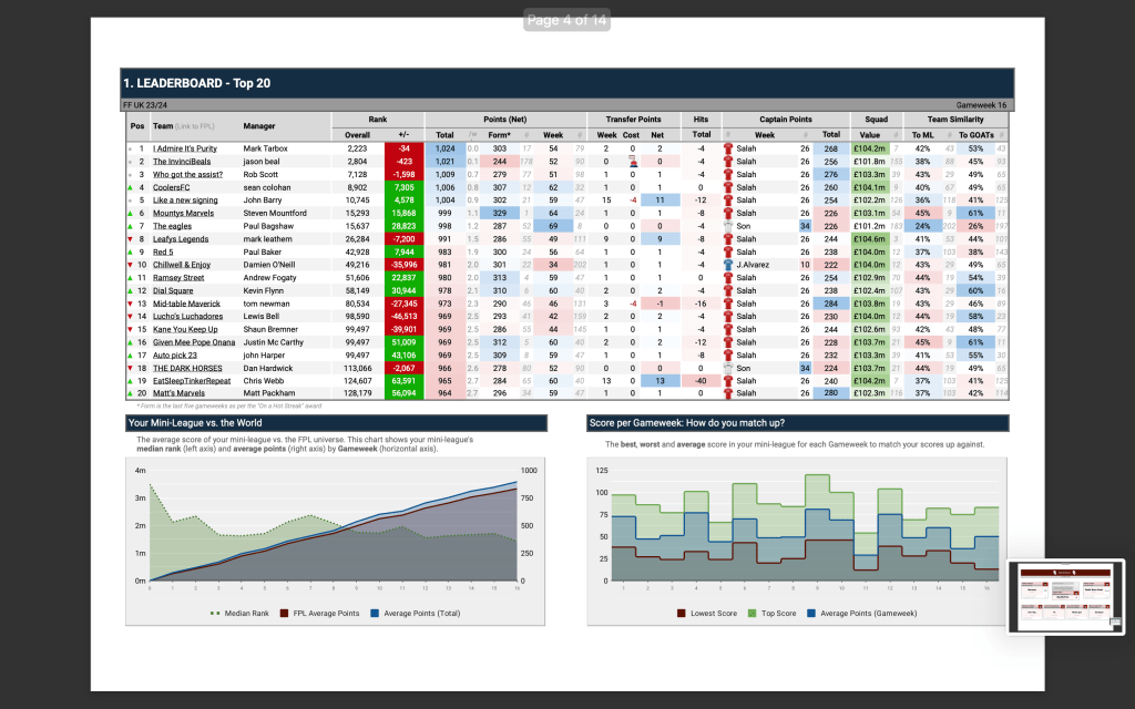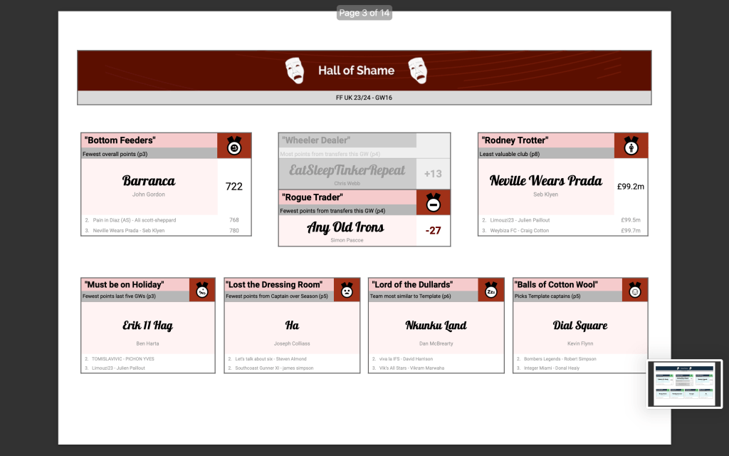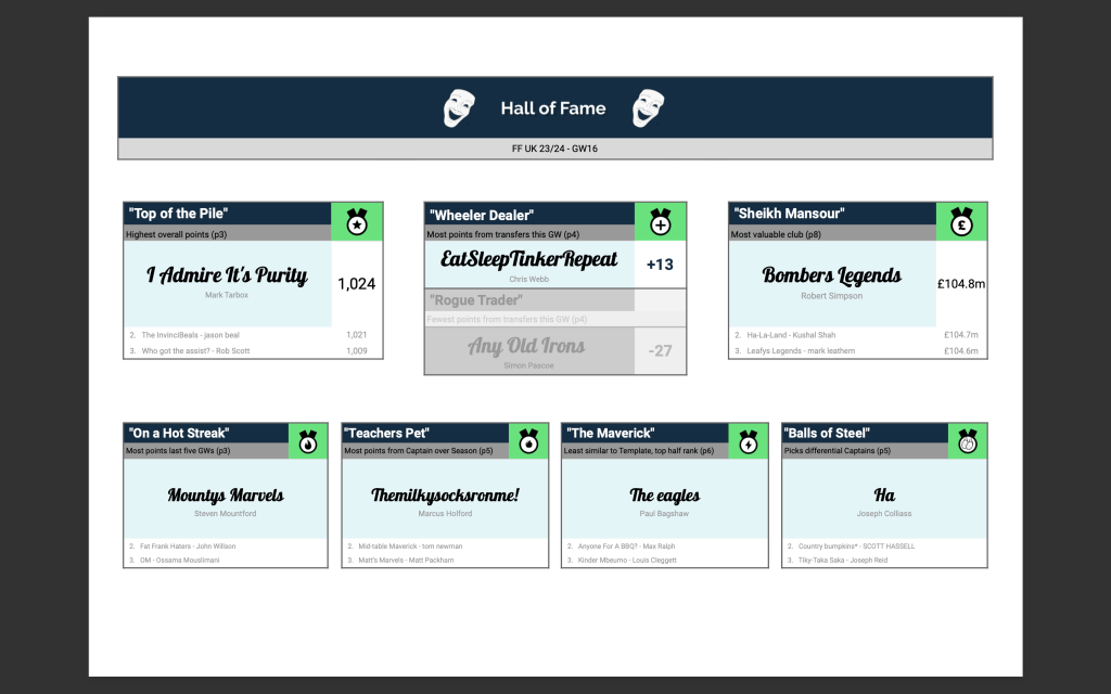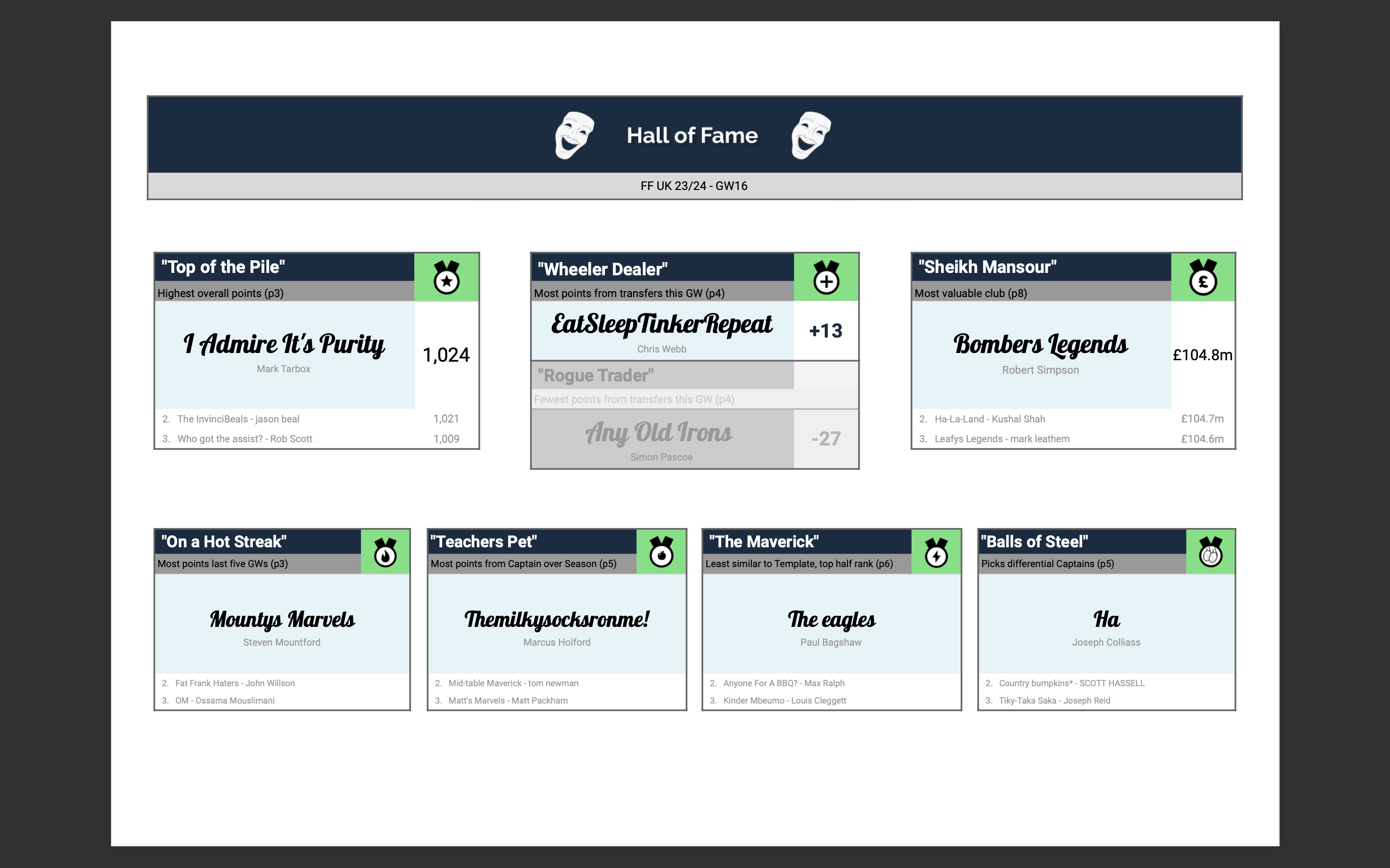 Thats all for this week, 1 more game week before the XMAS CONTS madness where 36 of us FFUKers will be eliminated in 3 weeks- how festive.