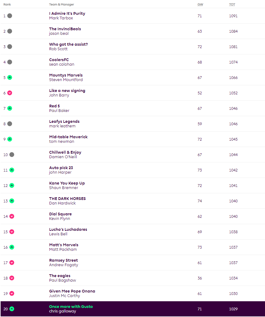 The unlucky FFUKer to go this week was Rod Watson (143rd) who managed just 31 points and finds himself evicted just before Xmas. Bad timing but you can focus on what is important. Mince pies.