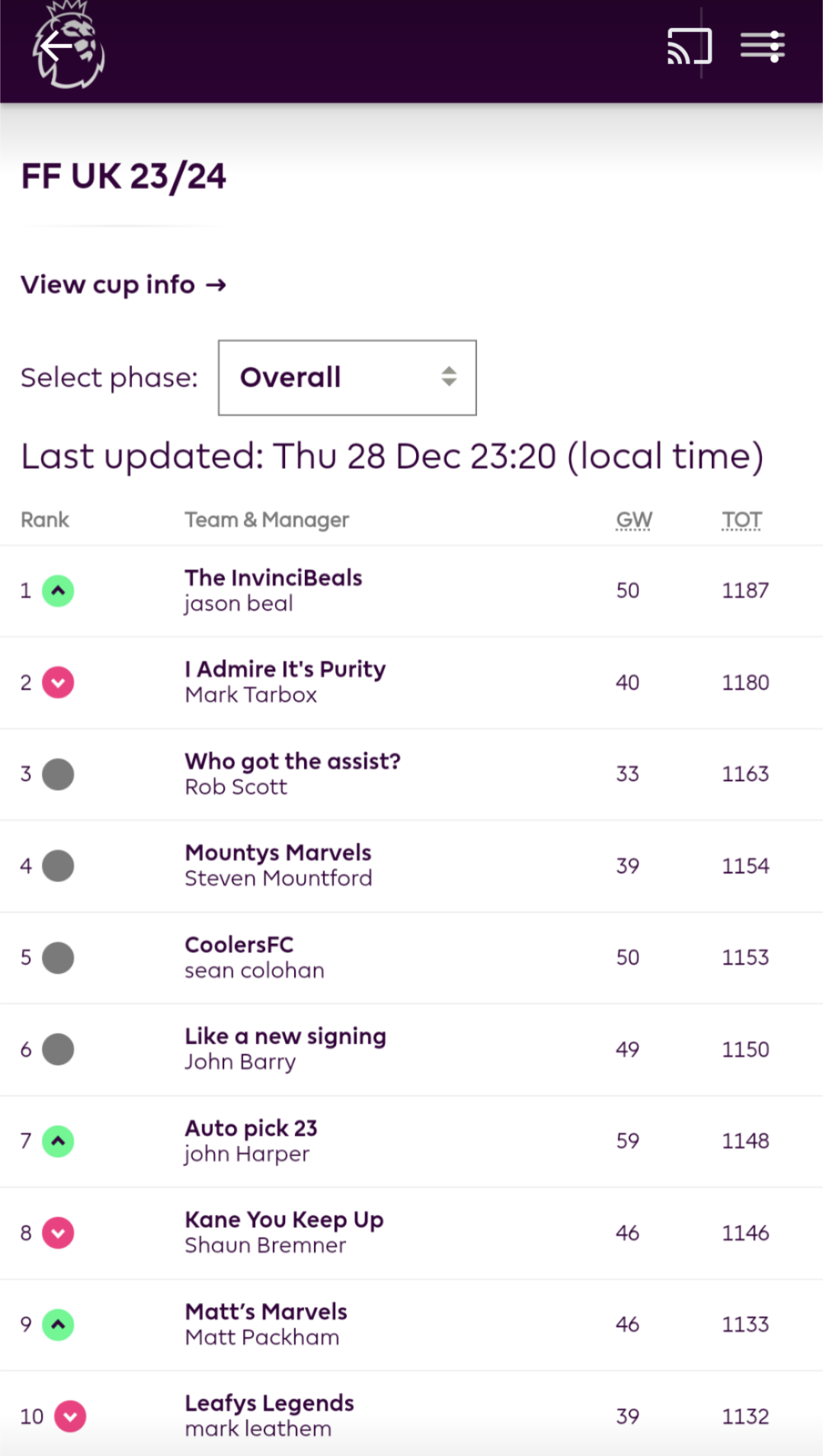 December is always a make or break time for me in FPL, sometimes without any real chance of the ‘make’ happening, but for a lot of teams its a time for really showing guts. The Top 10 going into the new year highlights the consistent performances of a number of FFUK players, not least the top 3.