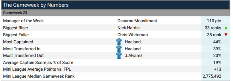 However, us FFUKers sensed a haul for City against Brentford, we weren’t wrong but many backed the wrong horse. With Haaland the most transferred in player in the FFUK league (by 39%!), he was also captained by 44.2%, with his partner in crime KDB captained by 24.6%. However, it was the young prince, Phil Foden that stole the show with a hat trick against Brentford. His 20 points gave him the prize of top hauler in GW23, with a new Cavani-esque celebration taking aim at those who sold him. (FYI – Haaland is still yet to score against Brentford, the only team he’s faced and not scored against in the PL)