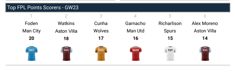 As many times already this season, those that reacted too quickly versus being patient seem to have been punished. Headline makers for GW23 were Ollie ‘Watto’ Watkins with a 18 point haul against a very doomed Sheffield United. The lad Watto has now 25 attacking FPL returns, 3 more than anyone else in the game.