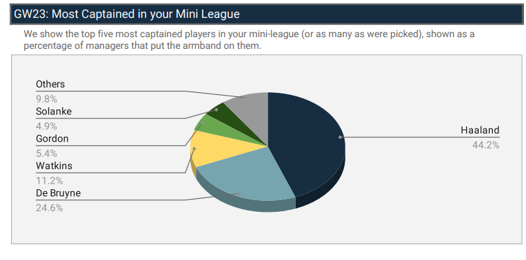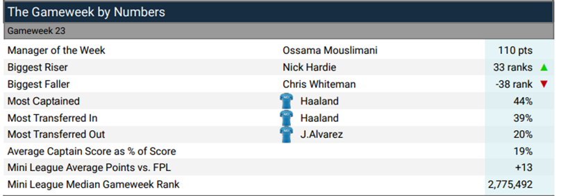 However, us FFUKers sensed a haul for City against Brentford, we weren’t wrong but many backed the wrong horse. With Haaland the most transferred in player in the FFUK league (by 39%!), he was also captained by 44.2%, with his partner in crime KDB captained by 24.6%. However, it was the young prince, Phil Foden that stole the show with a hat trick against Brentford. His 20 points gave him the prize of top hauler in GW23, with a new Cavani-esque celebration taking aim at those who sold him. (FYI – Haaland is still yet to score against Brentford, the only team he’s faced and not scored against in the PL)