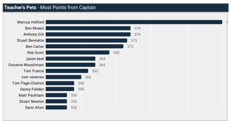 Couple of interesting bits of data for the FFUK league below. The first graph shows the literally off the chart haul of captain points Marcus Holford has picked up, and if you cross reference Marcus and his friends versus our league table with captain and bench boost points removed, the crossover is pretty slim. My take way from this is that captain points are a vital added bonus for players but don’t replace the importance of having a well balanced team hauling a high level of base points. I’d be interested in your thoughts too.
