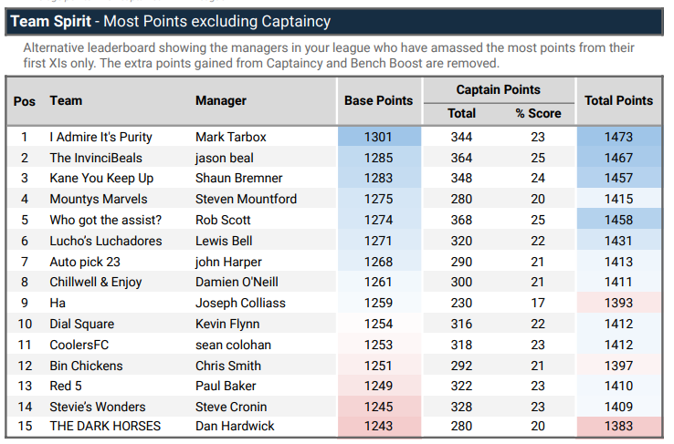 Mark Tarbox remains top of the pops, keeping ahead of Jason Beal and Rob Scott. With Mark still sitting a very impressive 1,417th in the game, nice one mate! But watch out previous FFUK league winners Ossama Mouslimani (GW23 top boy) and the legend Paul Baker, are now in the top 20. 👀📈
