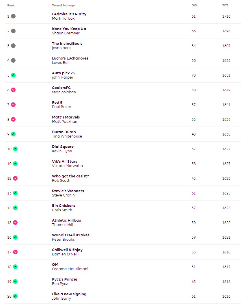 The names at the top are becoming very recognisable now, especially if you read these reviews. John Harper (5th) high scored in the top 20 with 70 points and this was largely thanks to the King of the GW, Bowen (20). Well done if you held on this long, proving patience really is a fantasy virtue!