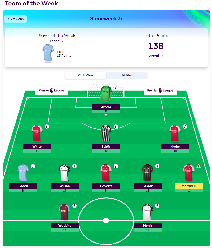 FODEN (15) and WATKINS (13) continue to fuel the hopes of England fans for Euro 24. The biggest surprise addition was LEWIS COOK (12), written off by many pundits as a DGW28 pick, will this change your view?