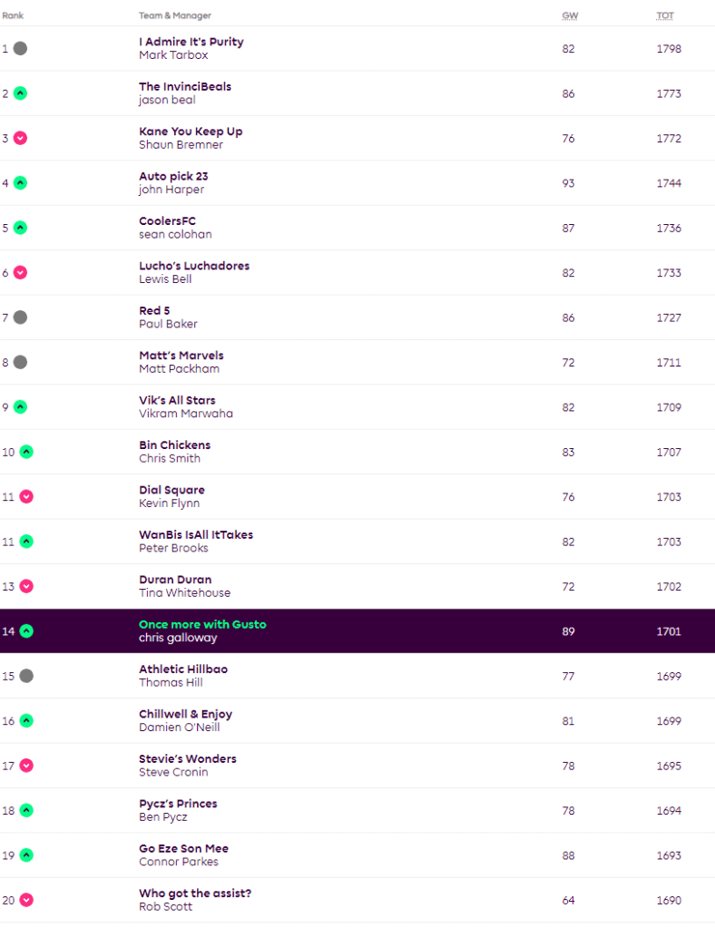 John Harper (AUTO PICK 23) top scored again in the Top 20 with 93pts, now up to 4th and only 54pts off top. With his wild card and bench boost still in hand, he’s one to watch.